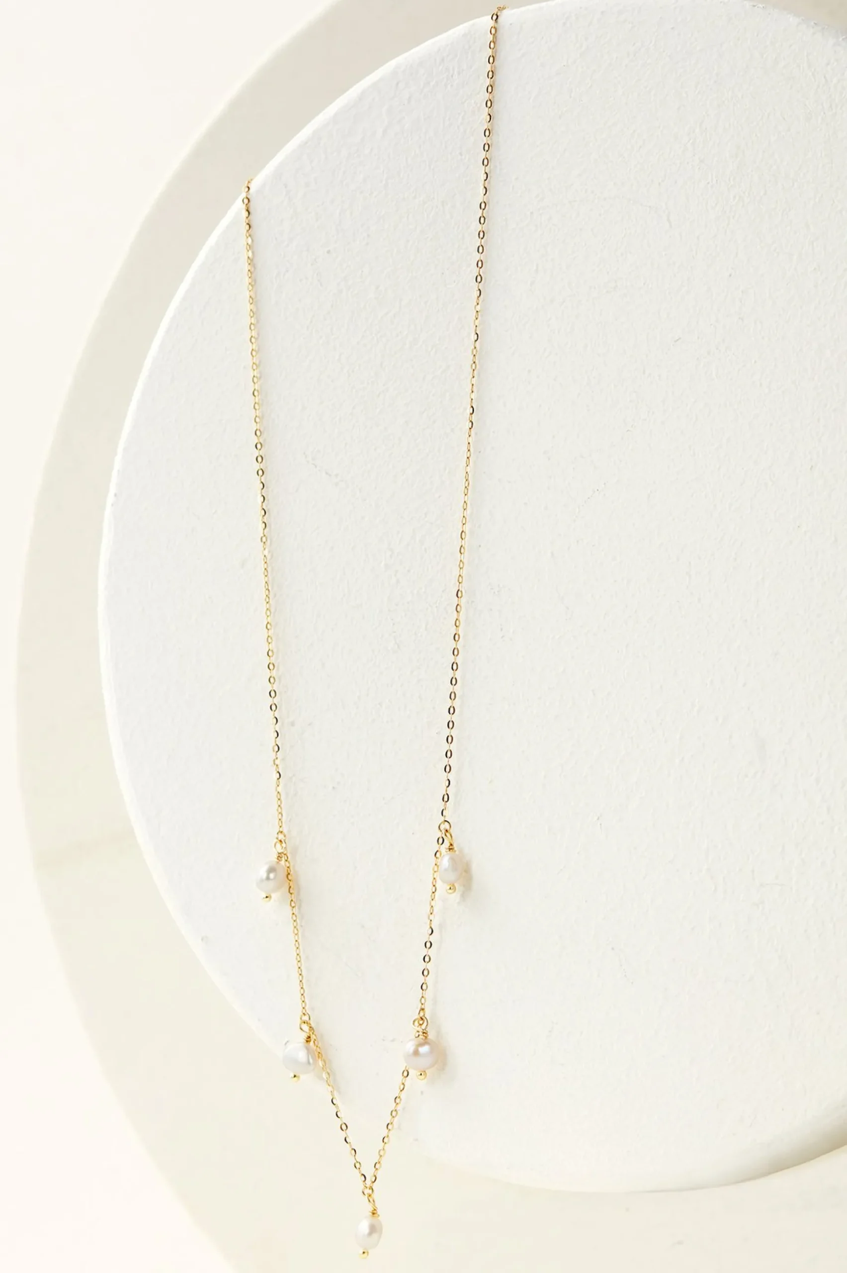 This pearl confection takes the trend to the most feminine of places with a whisper-light chain and five petite freshwater pearl drops. Plated in .925 sterling silver or 18K gold. Clasp closure.