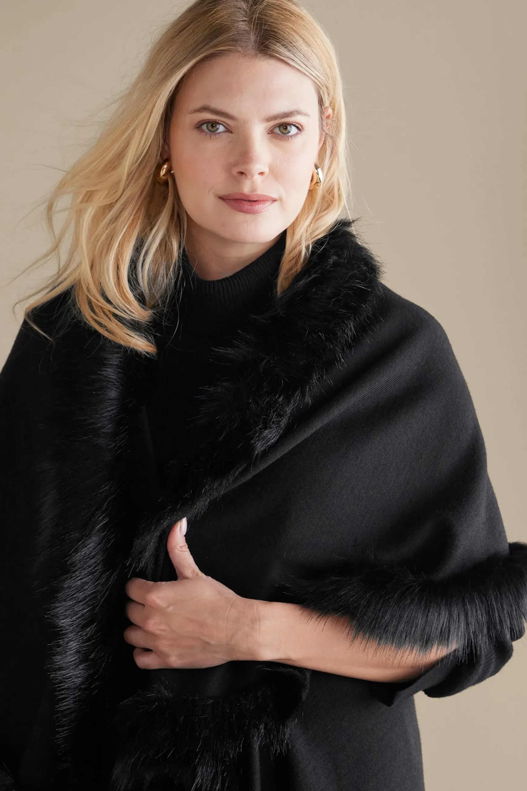 Plush faux fur trims this swingy wrap, which looks equally fabulous with jeans and a sweater or your favorite little black dress.