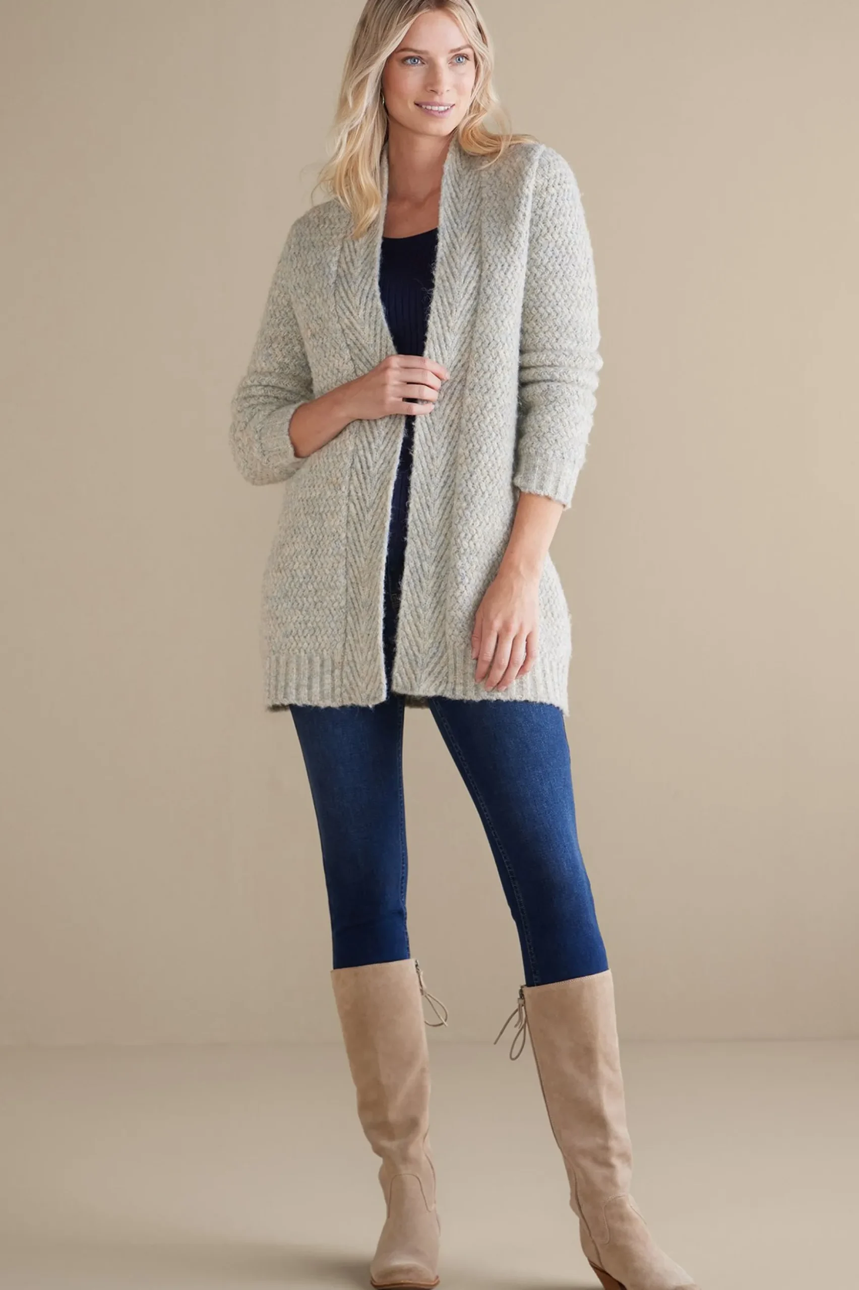 Every winter wardrobe needs a warm, grey cardi that adds toasty comfort to any outfit. This longline cardigan is a great length for boots and flared jeans or perfectly snuggly with leggings and a good book. If you look closely, you’ll notice that the unique yarn ombres from oatmeal to gray to tan, lending phenomenal depth to the herringbone stitch.