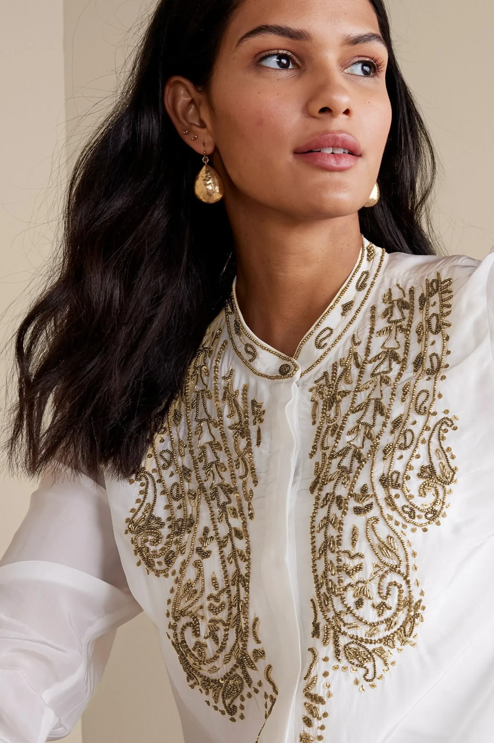 Sequins and beads in shades of antique gold and copper bedeck the mandarin collar and placket of this airy button down top. Matching buttons embellish the deep cuffs. This semi-sheer style comes with a knit cami for easy layering.