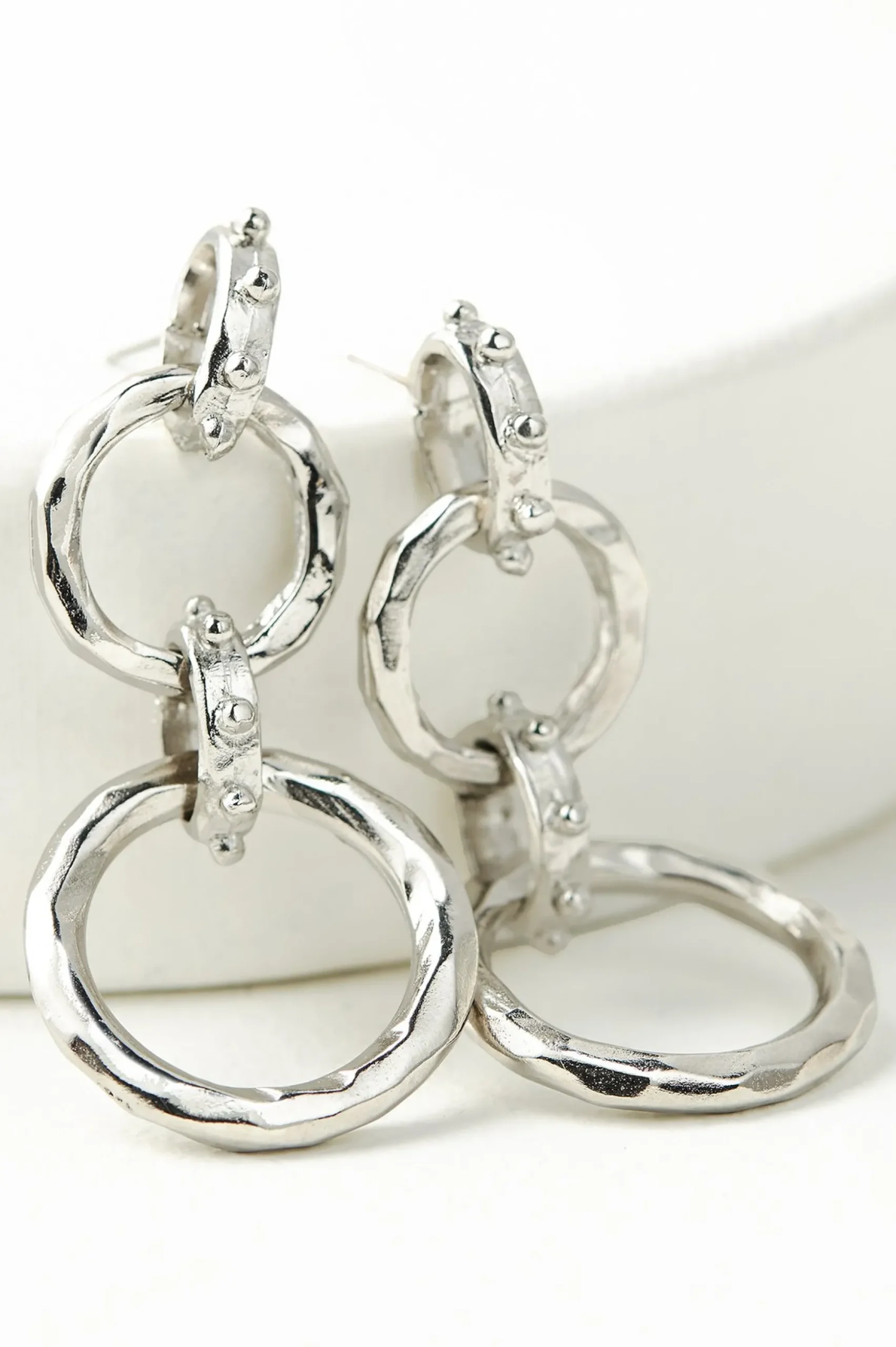The high shine of tiered hoops puts an exclamation mark on this season’s metallics trend. It’s a great look that wears so well with casual tees and elegant dresses alike. In gold or silver; you’ll want both tones to pair across your wardrobe. Tin and silver construction. Post back.